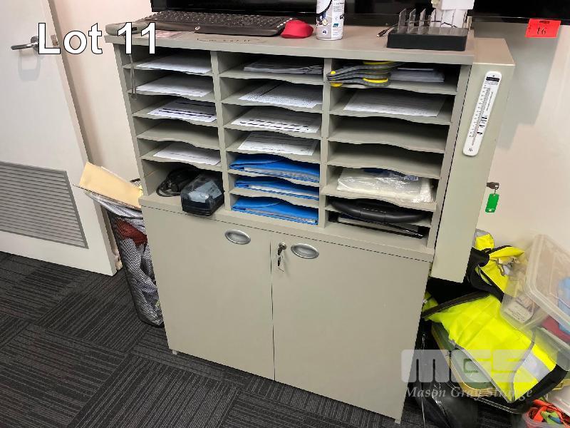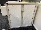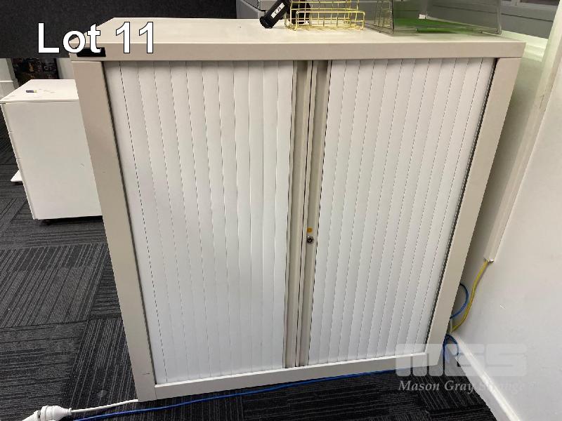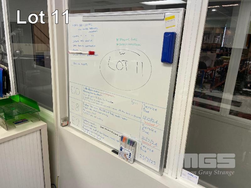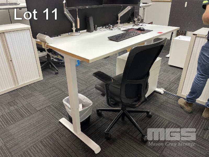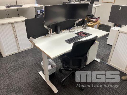 ELECTRIC RISE & FALL DESK, 1800 x 750mm, 2 x DELL 25" MOUNTED MONITORS, 2 x CREATIVE MOUNTED SPEAKERS, TAMBOUR STORAGE CABINET, 900 x 500 x 950mm, 3 DRAW UNDER DESK MOBILE, GAS LIFT CHAIR, WHITE BOARD, 900 x 900mm &GODFREY 3 DRAW CABINET, 900 x 500 x 1000mm (LOCKED)