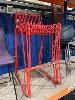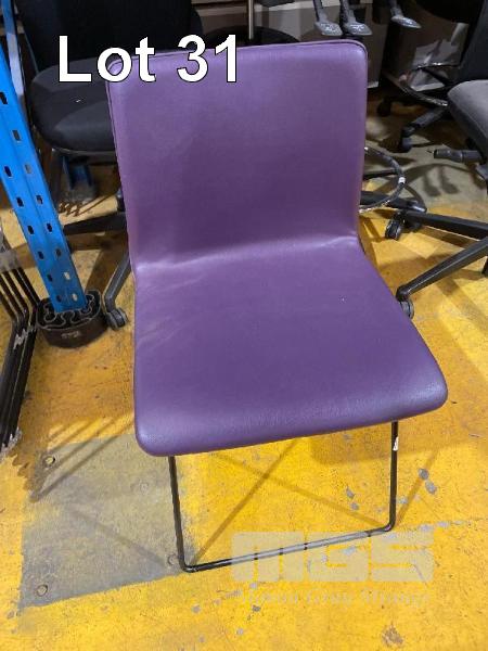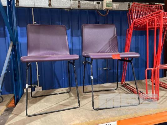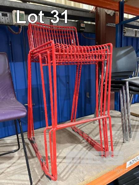 3 x PURPLE VINYL CHAIRS, 3 x RED STEEL BAR STOOLS 3 x STACKABLE CHAIRS, CHROME LEGS