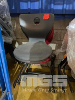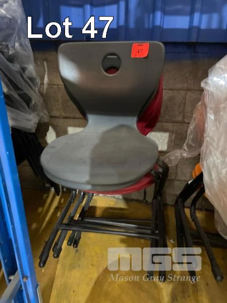 4 x STACKABLE CHAIRS, RED, BLACK STEEL FRAME, 2 x STACKABLE CHAIRS, GREY, BLACK STEEL FRAME