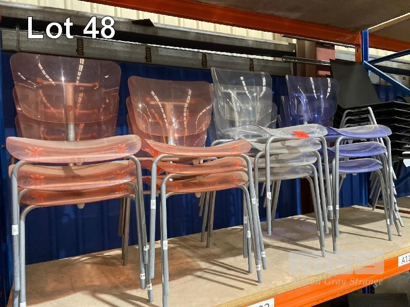 6 x RED PLASTIC CHAIRS, STEEL FRAME, 4 x CLEAR PLASTIC CHAIRS 3 x BLUE PLASTIC CHAIRS, 8 x BLACK PLASTIC CHAIRS