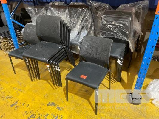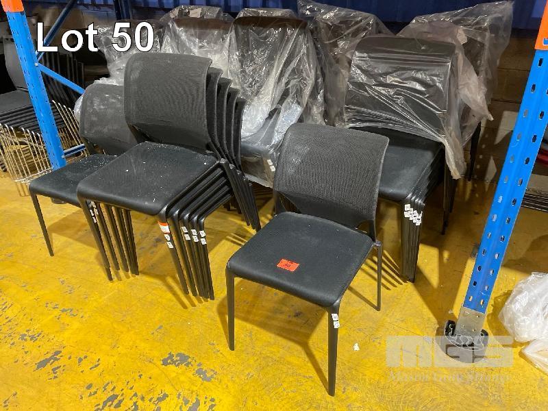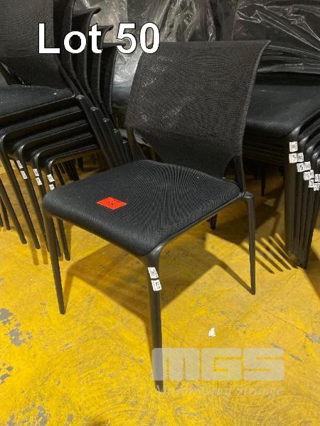 55 x STACKABLE CHAIRS, BLACK MESH, BLACK PLASTIC FRAME