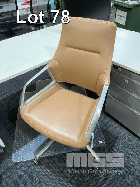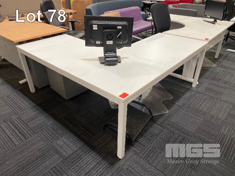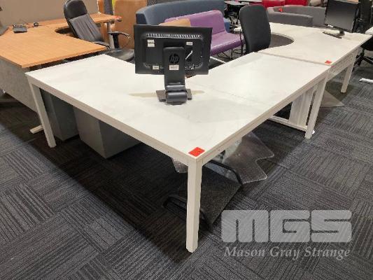 TIMBER LAMINATE DESK & RETURN, WHITE, 1800 x 1800mm, 3 DRAW UNDER DESK MOBILE, VINTAGE TAN LEATHER OFFICE CHAIR