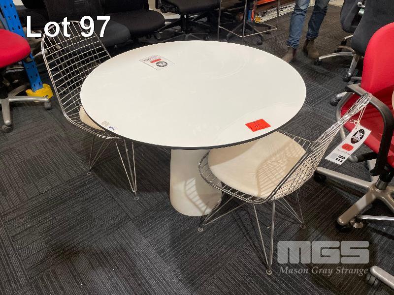 CAFE PEDESTAL TABLES, ARTIFICIAL STONE BASE, 900mm TOP, 2 x CHROME WIRE SEATS, WHITE VINYL TOPS