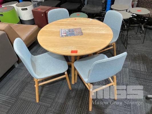 CIRCULAR TIMBER TABLE, 1000mm (D), 4 x LIGHT BLUE FELT CHAIRS, TIMBER LEGS