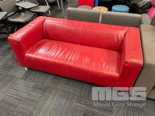 RED LEATHER 2 SEATER COUCH, 1800mm (L), STEEL FEET