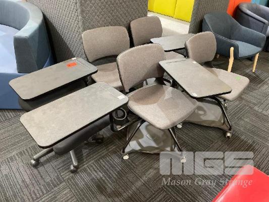 PAIR MOBILE EXAM DESKS, SWIVEL TOPS, GREY CLOTH SEATS, +1 ERGONOMIC KNEELING CHAIR