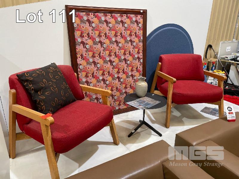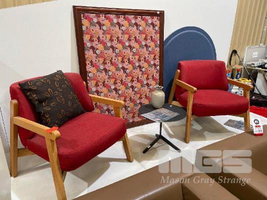PAIR RED VISITORS CHAIRS, TIMBER LAMINATE FRAME, WITH SIDE TABLE, & ABORIGINAL PRINT, 1330 x 1000mm