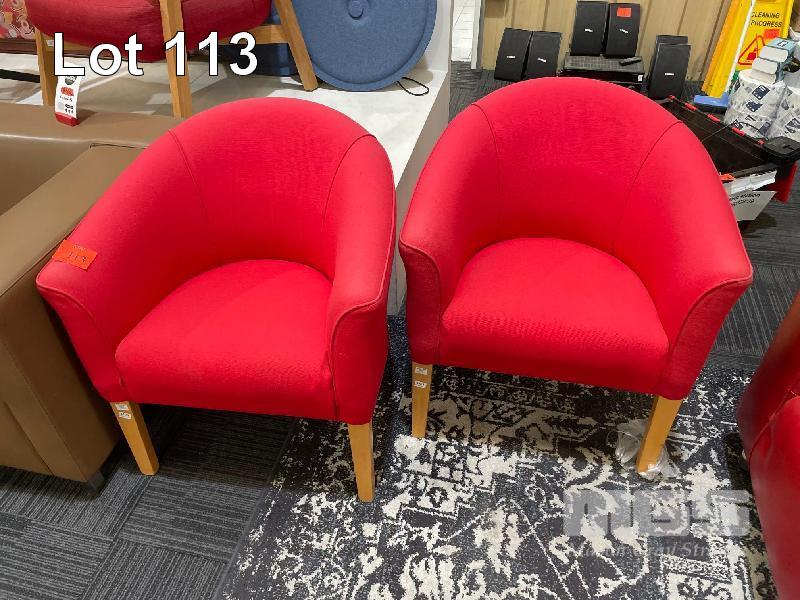 PAIR RED VISITORS CHAIRS, CLOTH, TIMBER LEGS