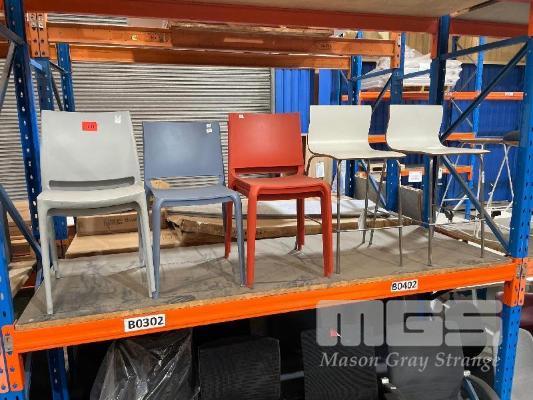 5 x PLASTIC CHAIRS, ASSORTED COLOURS, 2 x BAR STOOLS, WHITE TIMBER SEATS, CHROME LEGS