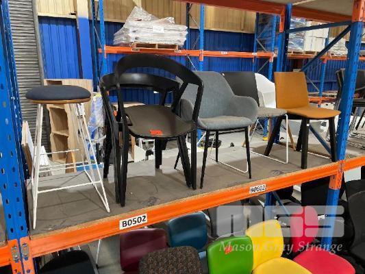 2 x BAR STOOLS, 3 x BLACK PLASTIC CHAIRS, STACKABLE, 4 x ASSORTED VISITORS CHAIRS