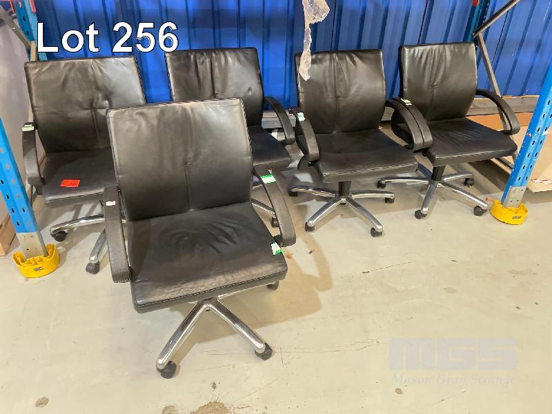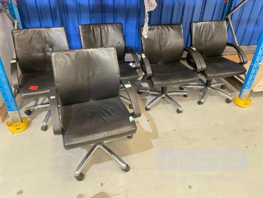 5 x BLACK LEATHER GAS LIFT OFFICE CHAIRS, (MATCHING SET)
