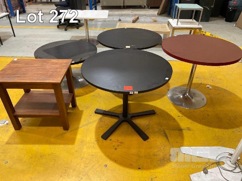 PAIR BLACK CIRCULAR TABLES, 900mm (D), 1 x BURGANDY CIRCULAR TABLE, 900mm (D), 1 x BLACK PEDESTAL COFFEE TABLE, 1000mm (D), TIMBER SIDE TABLE, 660 x 500mm