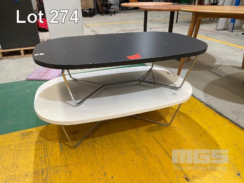 2 x LOW LINE COFFEE TABLES, WHITE & BLACK, CHROME LEGS, 1100 x 700mm