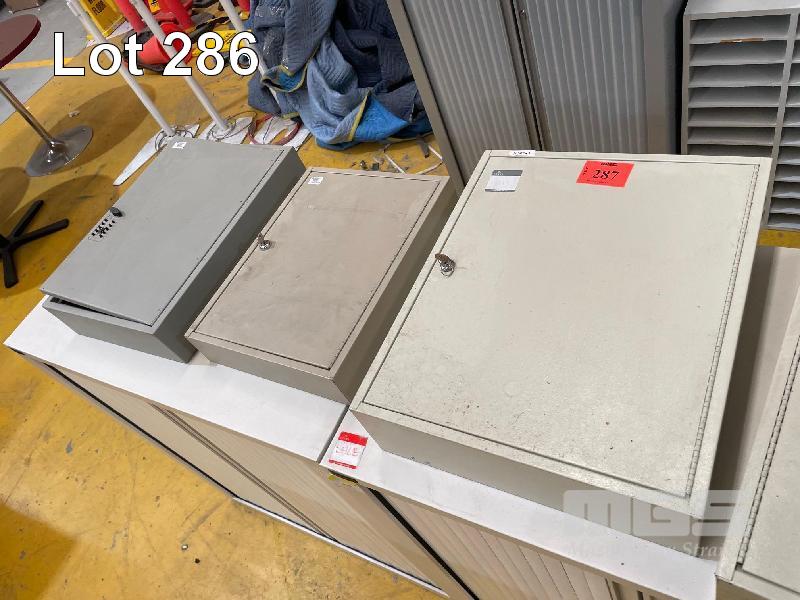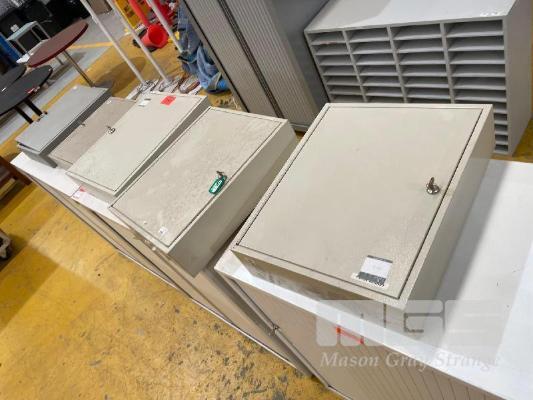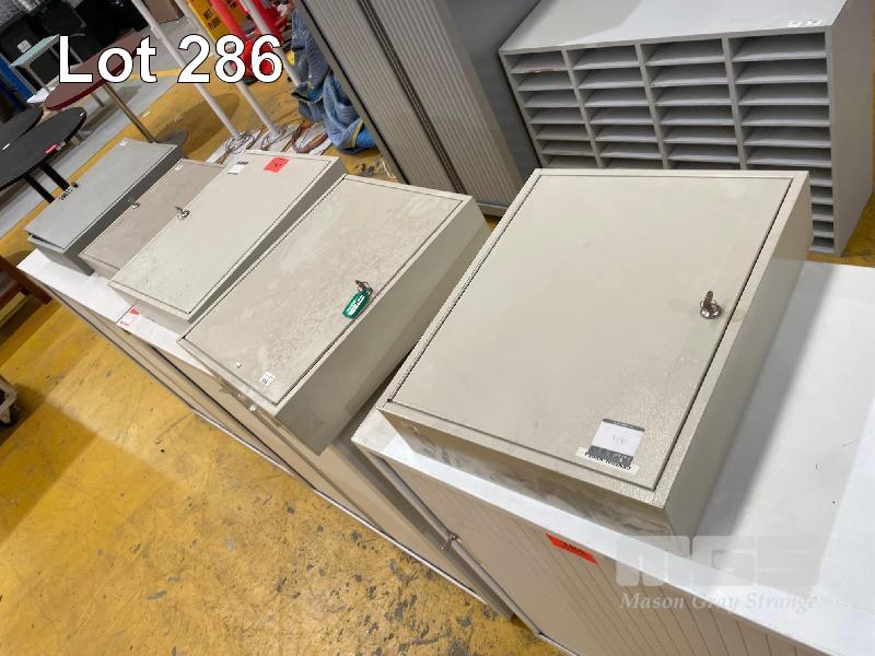 4 x STEEL WALLMOUNT KEY CABINETS WITH KEYS, 1 x COMBINATION (OPEN)