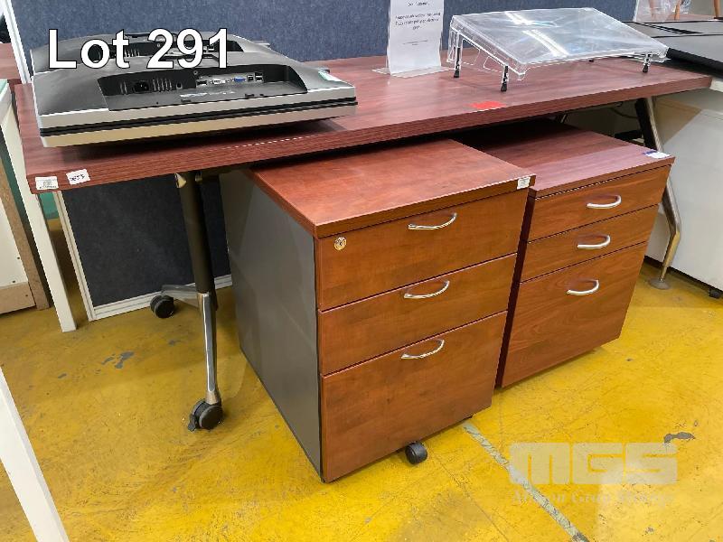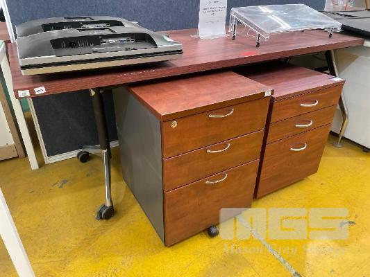 3 x MOBILE TIMBER LAMINATE DESKS, DARK, 1800 x 750mm, 2 x 3 DRAW UNDER DESK MOBILES
