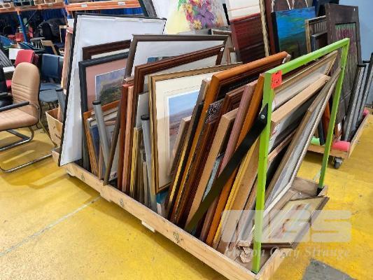 LARGE QTY ASSORTED ARTWORK, PRINTS, PAINTINGS & PHOTOGRAPHS + MOBILE ART STORAGE TROLLEY, LOCKING CASTOR WHEELS