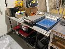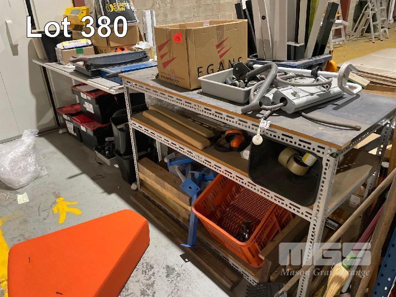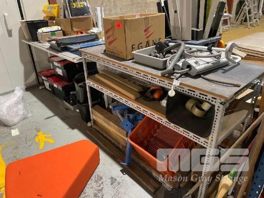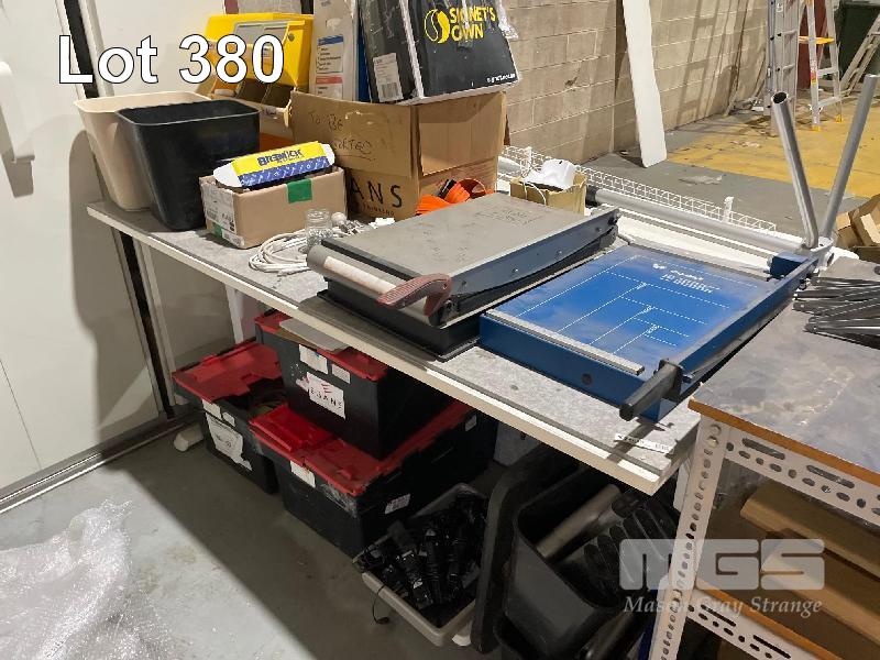 2 x WORK BENCHES & CONTENTS, HARDWARE, PAPER GUILLOTENES, ELECTRICAL CABLES ETC.