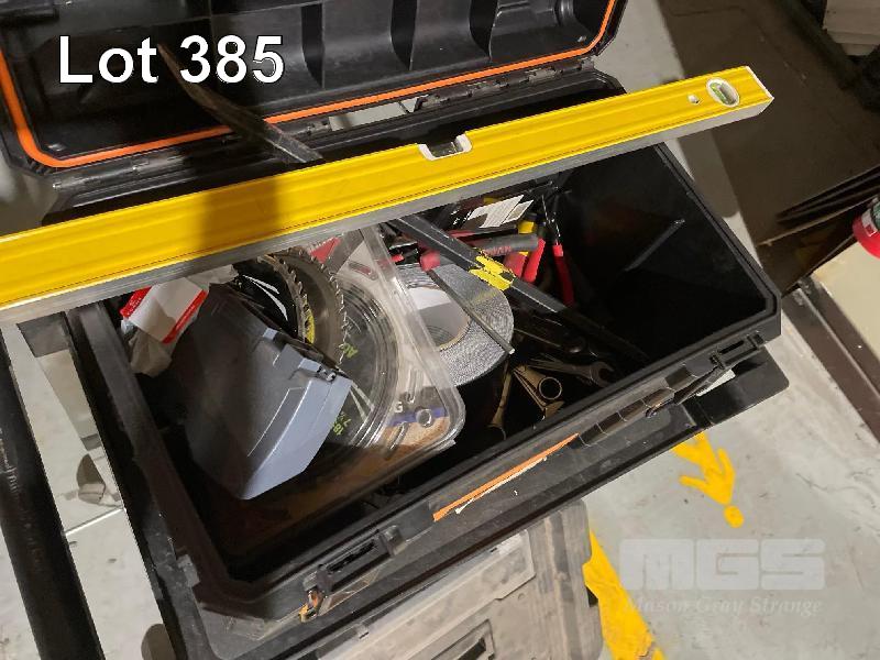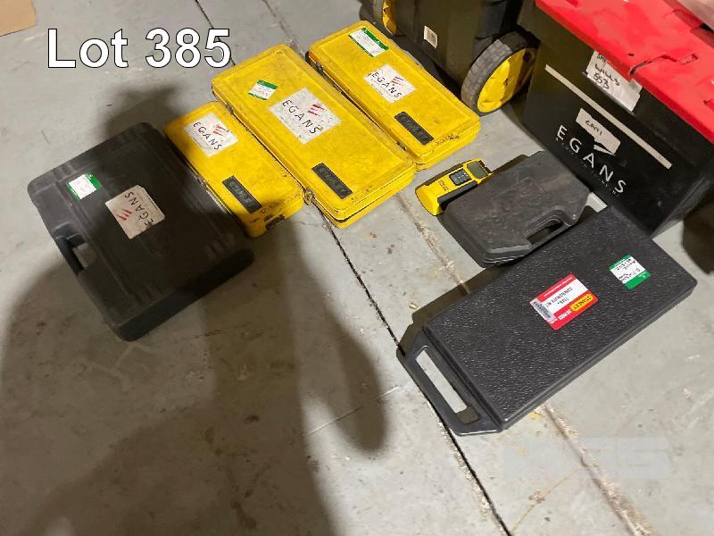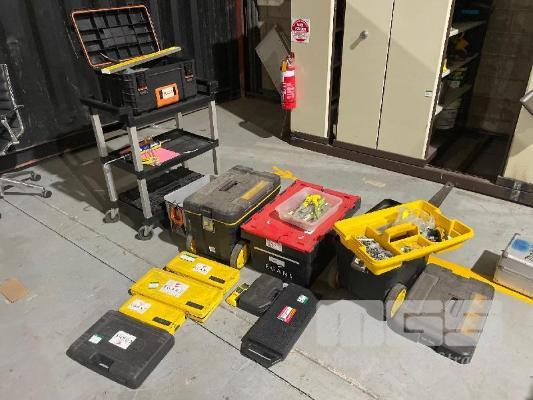 5 x TOOL TUBS, CLAMPS, POP RIVET GUN, STANLEY HAND TOOL KITS, STUD FINDER, FUSES, SPIRIT LEVEL, ASSORTED HARDWARE, HOLE SAW SET, LARGE QTY ASSORTED HANDTOOLS ETC.