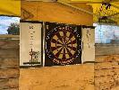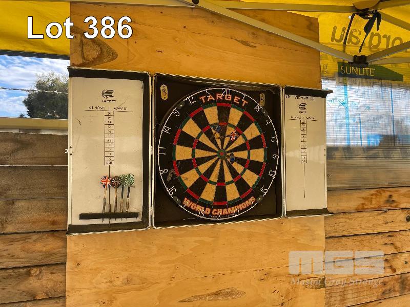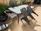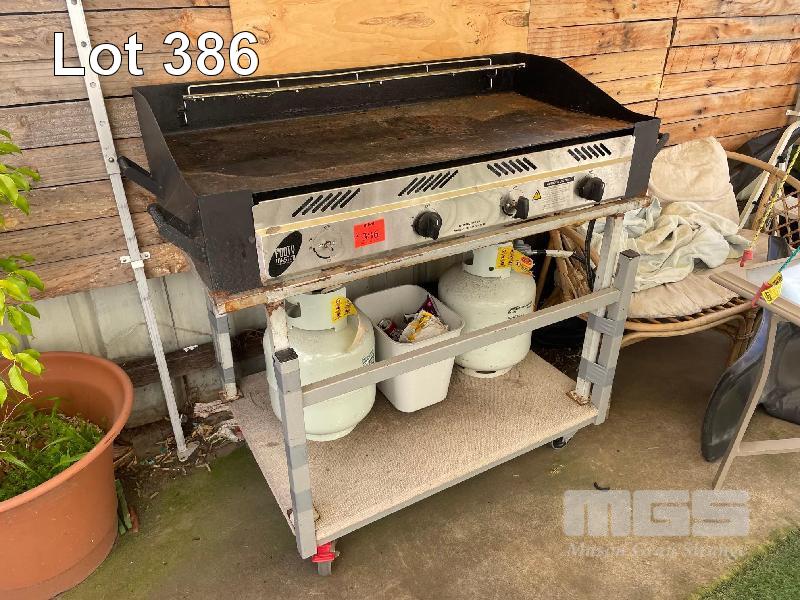 FOOTY MASTER 4 BURNER BBQ, 2 x GAS BOTTLES, DART BOARD, 2 x GLASS TABLES, 8 x PLASTIC CHAIRS, 4 x CIGARETTE BINS