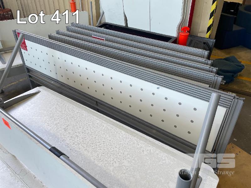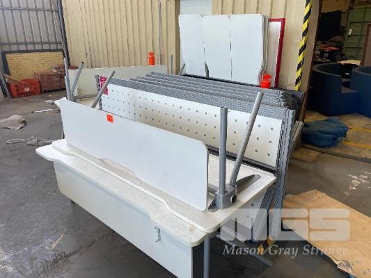 6 x WHITE TIMBER LAMINATE DESKS, 5 x OFFICE PARTITIONS