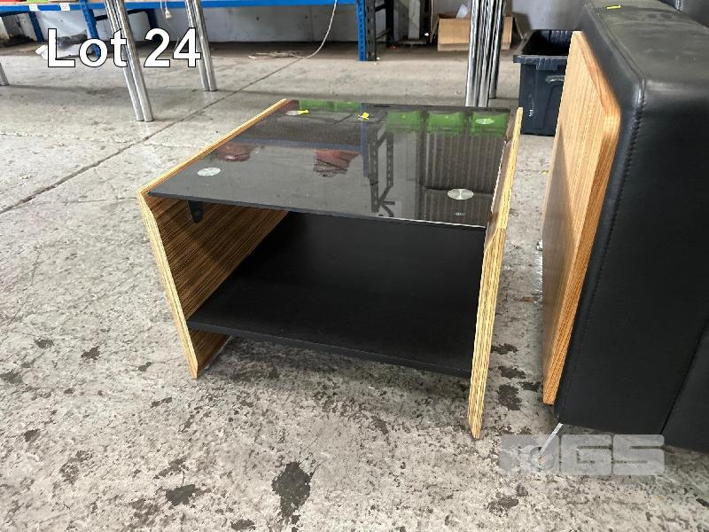 OFFICE LOUNGE SET 2 x 2 SEATER COUCHES, BLACK LEATHER, TIMBER LAMINATE SIDES, 1500mm (L) 2 x GLASS TOP SIDE TABLES, TIMBER LAMINATE SIDES 600 x 600 x 430mm (H)