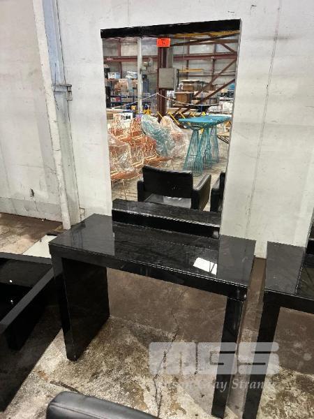 2 x SALON MIRRORED VANITY UNITS, GLASS TOP, BLACK TIMBER LAMINATE FRAME 1000 x 250 x 1000mm (H)