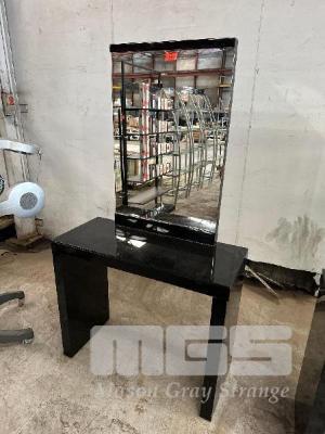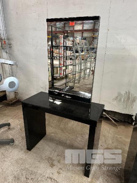 SALON MIRRORED VANITY UNIT, GLASS TOP, BLACK TIMBER LAMINATE FRAME 1000 x 250 x 1000mm (H)