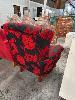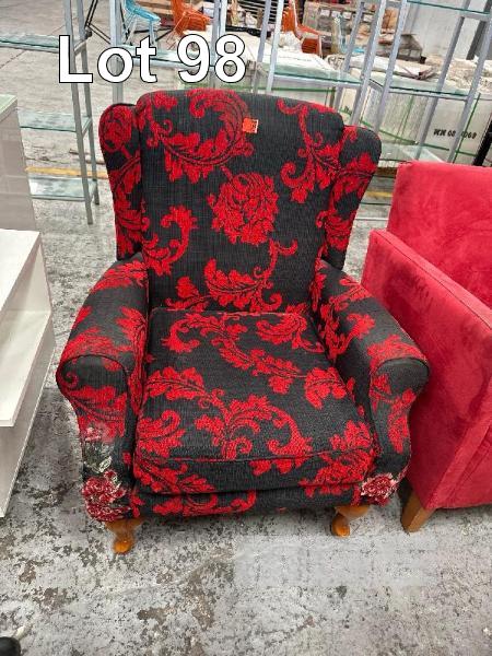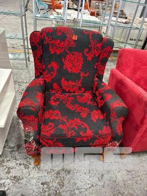 FLORAL PATTERED ARM CHAIR, BLACK/ RED FABRIC