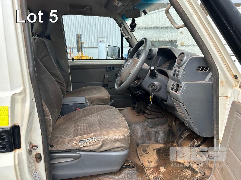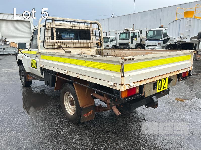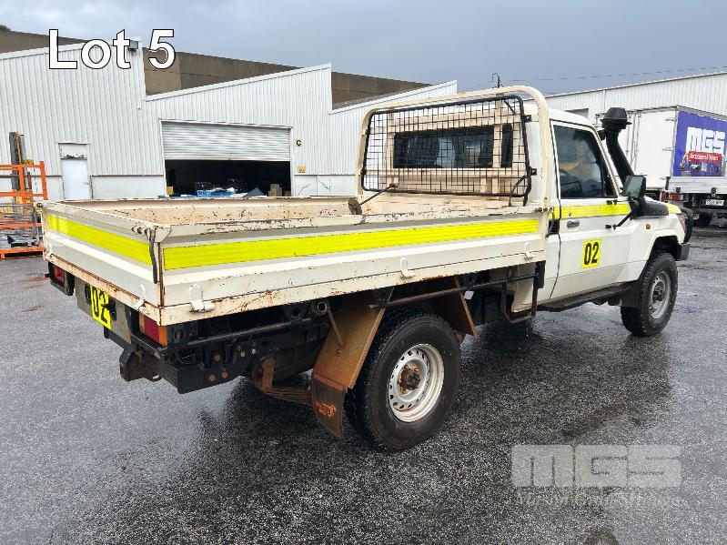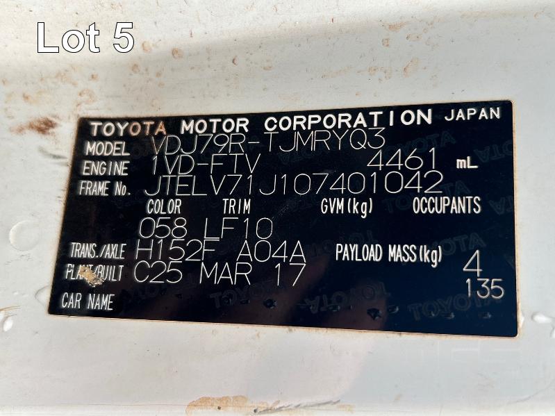 2017 TOYOTA LANDCRUISER VDJ79R SINGLE CAB TRAY TOP 4x4 REG: NO PLATES VIN: JTELV71J107401042 ODO: 172,954ksm SHOWING V8 TURBO DIESEL, 4.5 LITRE, WHITE DUCO, 2 DOORS, 2 SEAT, 4x4 ABS, AIR BAG, AIR CON, BULL BAR, CARGO BARRIER, CD PLAYER, CRUISE CONTROL, DECALS, SIDE STEP, STEEL TRAY, TOW BAR, PLANT NO: EXP02 DUAL BATTERIES SNORKEL AIR INTAKE FRONT MOUNT WINCH, LED SPOT LIGHTS REAR SLIDE OUT TRAY KEY #48 (WITH 1 KEY/S) CONDITION: ENGINE - RUNS BUT HAS A LOT OF TAPPET NOISE - NO OIL PRESSURE SHOWING ON GAUGE ALL FAULTS - NOTES SAY ENGINE MAY HAVE OVERHEATED