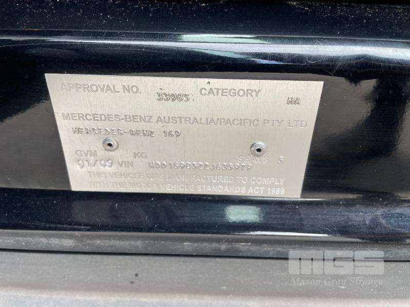 2009 MERCEDES BENZ A170 HATCHBACK FWD REG: S493 AAX (SA) VIN: WDD1690322J635979 ODO: 184,170 AUTO SPEED BLACK, 5 DOORS, 5 SEAT, FWD AIR BAG, AIR CON, ALLOY WHEELS, BLUETOOTH, CENTRAL LOCKING, CRUISE CONTROL, POWER WINDOWS, TRACTION CONTROL, TRANSMISSION FAULT, DRIVES NEEDS REPAIR KEY #11 (NO PAPERS, WITH 1 KEY/S, WITH OWNER'S MANUAL, WITH SERVICE BOOKS)