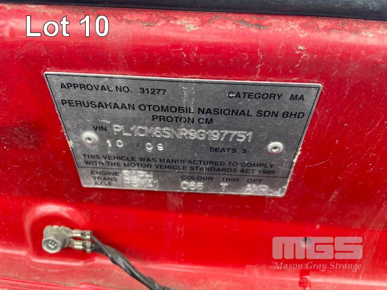 2009 PROTON PERSONA SEDAN FWD REG: S247ADZ (SA) VIN: PL1CM6SNR9G197751 ODO: 123,343 1.6L MPFI 4 CYL, 5 SPEED MANUAL, PETROL, RED, 4 DOORS, FWD ABS, AIR BAG, AIR CON, ALLOY WHEELS, POWER WINDOWS, FRONT & REAR BUMPER FADED KEY #6 (NO PAPERS, WITH 1 KEY/S, WITH OWNER'S MANUAL, WITH SERVICE BOOKS)
