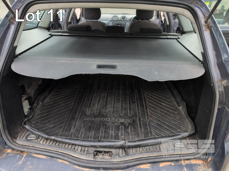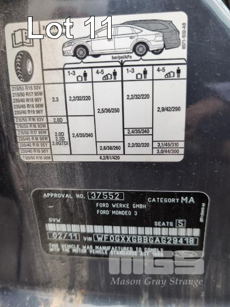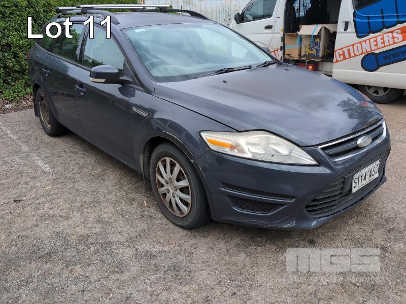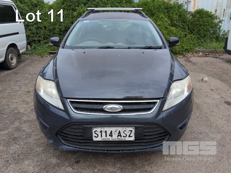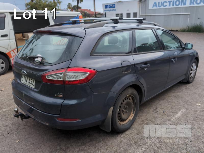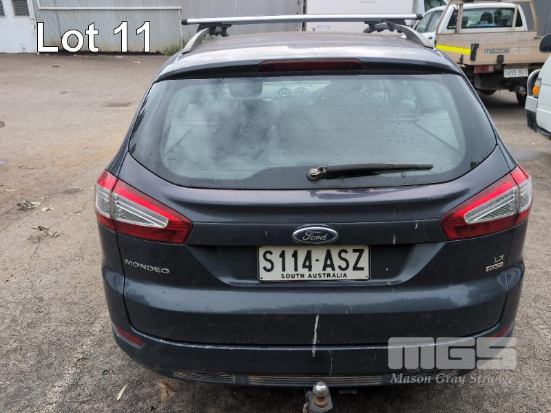 2011 FORD MONDEO LX WAGON REG: S114 1SZ (SA) (EXPIRED) VIN: WF0GXXGBBGAG29418 ODO: 273,947ksm SHOWING 2.0L DURATOG-TDCi ENGINE, AUTOMATIC TRANSMISSION, TURBO DIESEL, MIDNIGHT GREY DUCO, 5 DOORS, 5 SEAT, FRONT ABS, AIR CON, CENTRAL LOCKING, POWER STEERING, POWER WINDOWS, ROOF RACKS, SPARE WHEEL, TOW BAR, ENGINE LIGHT LIT, TRANSMISSION FAULT KEY # 34 (NO PAPERS, WITH 1 KEY/S, WITH OWNER'S MANUAL, WITH SERVICE BOOKS)
