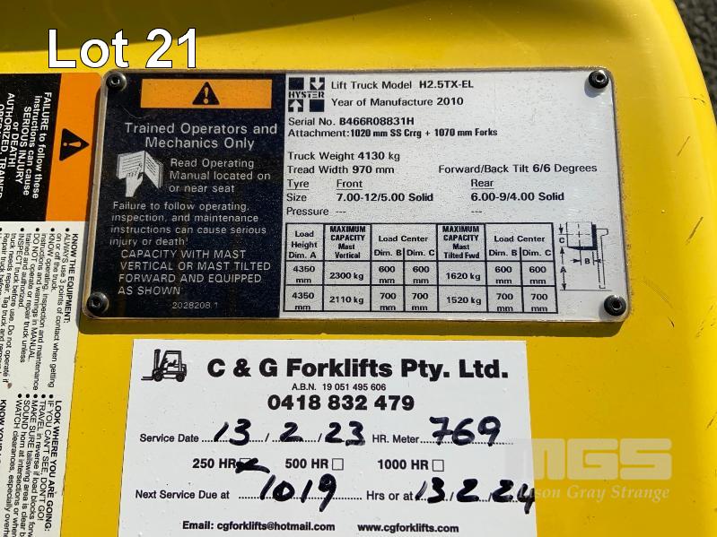 2010 HYSTER FORKLIFT 2.5, MOD: H2.5TX.EC, REG: S12SSM, S/NO: B466R08831H, SIDE SHIFT, SOLID TYRES, CONTAINER MAST, 782.8 HRS, LPG, WORK LIGHTS, REVERSE BUZZER, WITH PAPERS, 1 x KEY EXCELLENT CONDITION