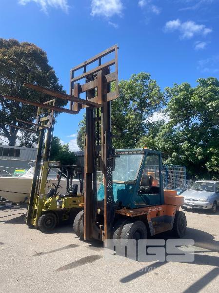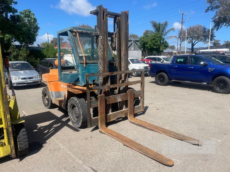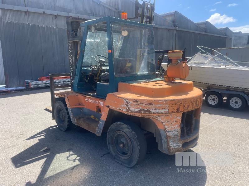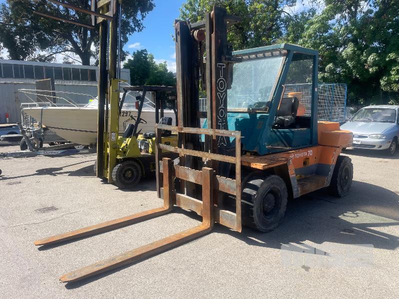 TOYOTA FORKLIFT MOD: 70 CAPACITY: 7,000kg DIESEL HOURS: 3,636 2 STAGE MAST, CLEAR VIEW DUAL FRONT WHEELS NOTE: HYDRAULIC LEAKS, CRACKED WINDSHIELD, RUNS & DRIVES KEY #13