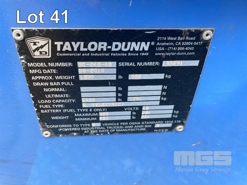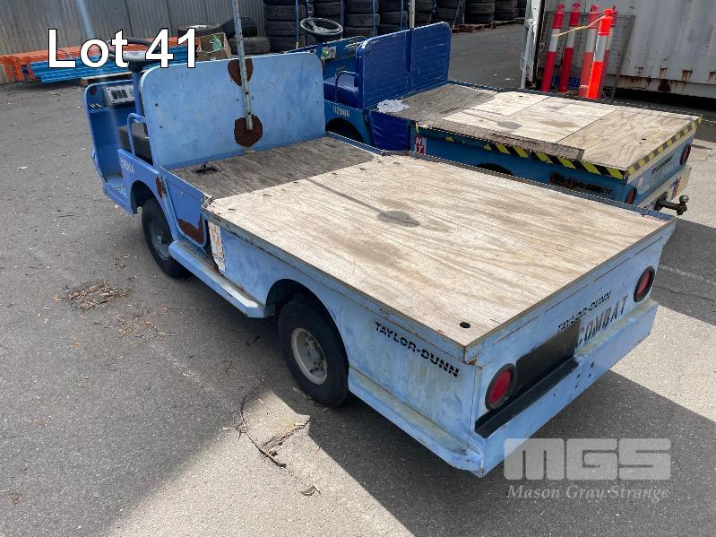 ELECTRIC FLAT BED BUGGY, TAYLOR DUNN MOD: B0-248-48 S/NO: 195291 VOLTS: 48 LOAD CAPACITY: 2,400kg BED LENGTH: 1920 (L) x 1200mm (W)