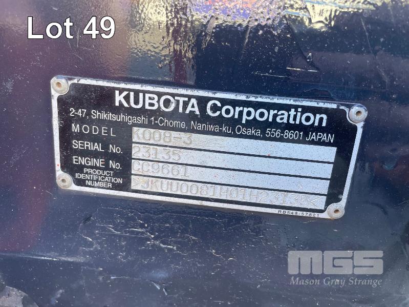 KUBOTA MINI EXCAVATOR, MOD: K008-3, SERIAL: 23135, ENGINE NO: CC9661, PIN: JKUU0081H01H23135 HRS: 1467, BOOM HYDRAULIC HOSE ATTACHMENT, GOOD TREAD ON TRACKS WITH 4 x ATTACHMENTS: RIPPER - 400mm, SMALL BUCKET - 270mm, MEDIUM BUCKET - 350mm, LARGE BUCKET - 800mm KEY #7