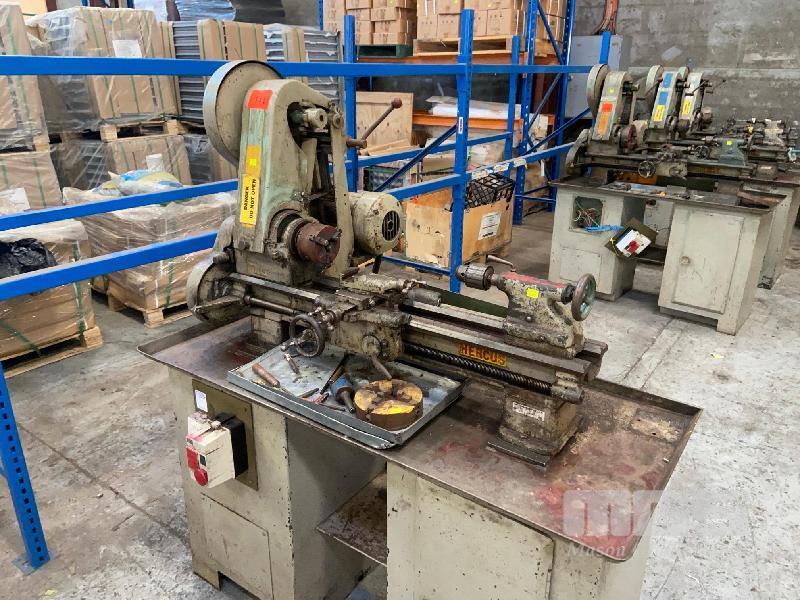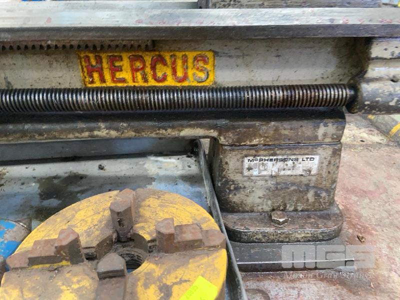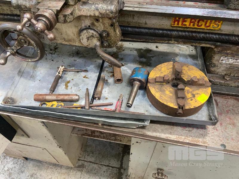 METAL WORKING LATHE, HERCUS 9" MOD: CR BED LENGTH: 750mm BETWEEN CENTRES: 550mm SWING: 240mm FEED THROUGH: 20mm WITH 3 JAW CHUCK, 100mm & 4 JAW CHUCK, 150mm LIVE CENTRE, CHUCK & TOOL HOLDERS 415V