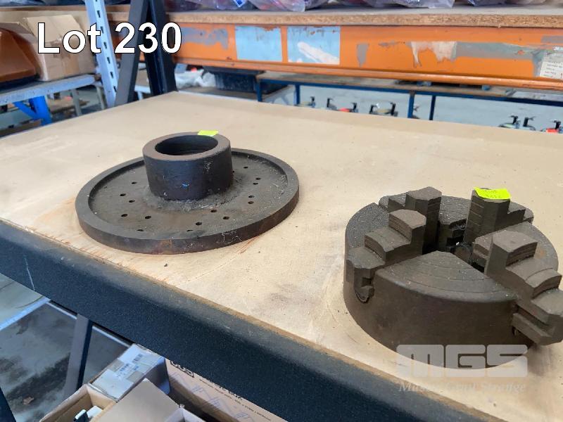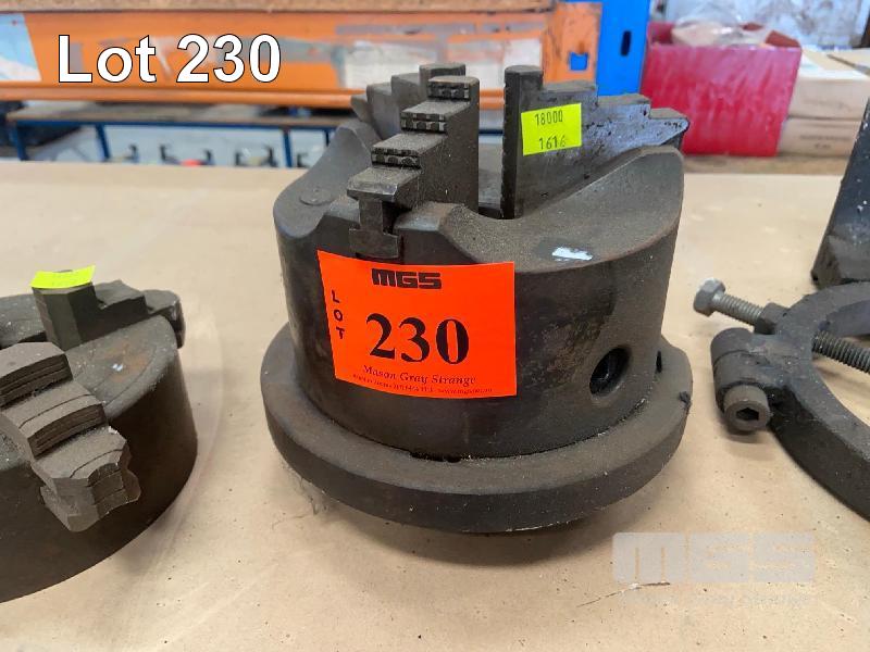 ASSORTED LATHE ACCESSORIES, 6" x 4 JAW CHUCK, 7" x 3 JAW CHUCK, 2 x 3 POINT STEADYS & 1 x 10" FACE PLATE