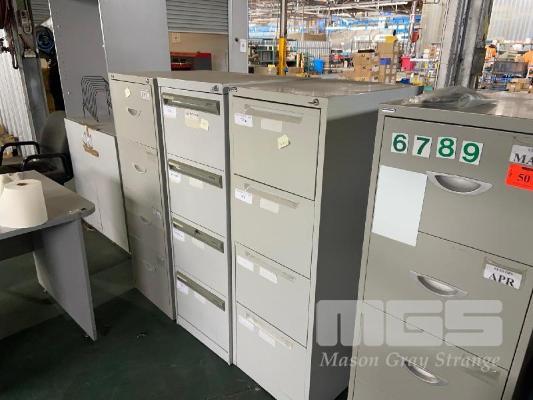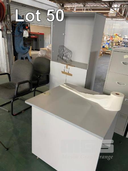 6 x 4 DRAWER STEEL FILING CABINETS TIMBER LAMINATE TABLE, 3000 x 1200mm CORNER DESK & CUPBOARD