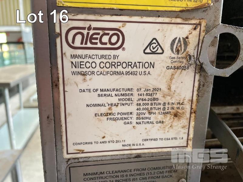 CONVEYOR OVEN, NIECO MOD: JF64-2GBG S/NO: 141-53877 DOM: 2021 2 TIER, NATURAL GAS, 240V 15AMP PLUG