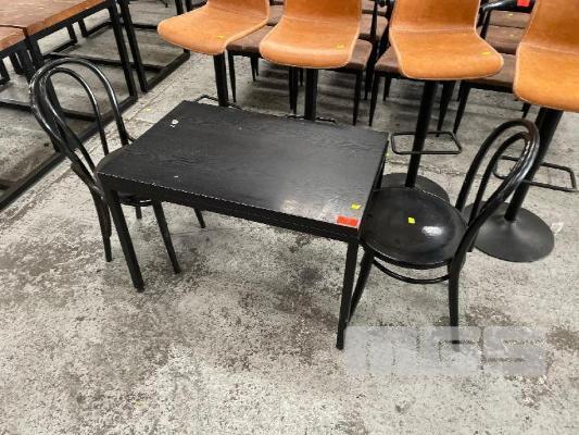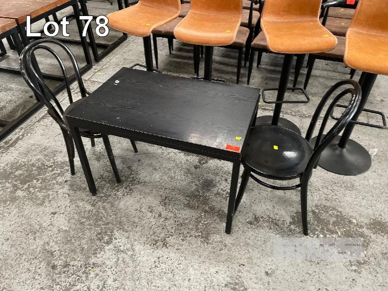 2 x BLACK BENT WOOD CHAIRS WITH BLACK TIMBER COFFEE TABLE, 1000 x 750mm