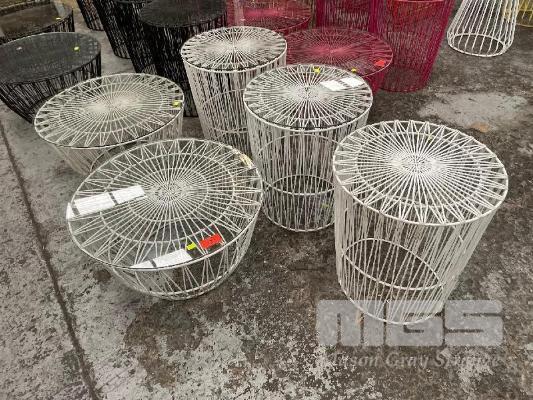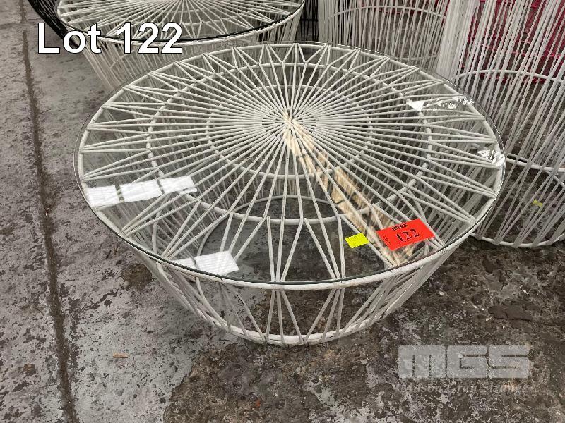 5 x OUTDOOR WIRE FRAME COFFEE TABLES, GLASS TOP, WHITE 3 @ 450mm (D) x 530mm (H) 2 @ 630mm (D) x 330mm (H)