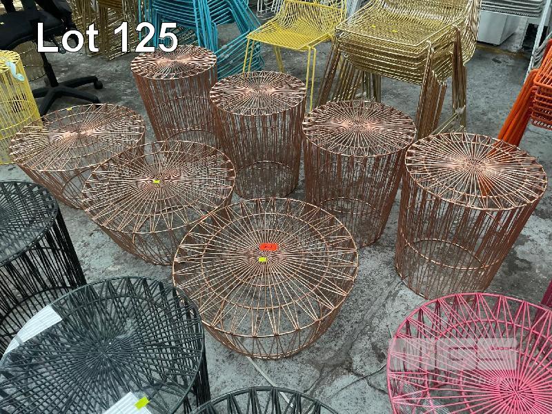 7 x OUTDOOR WIRE FRAME COFFEE TABLES, (NO GLASS), ROSE GOLD 4 @ 450mm (D) x 530mm (H) 3 @ 630mm (D) x 330mm (H)