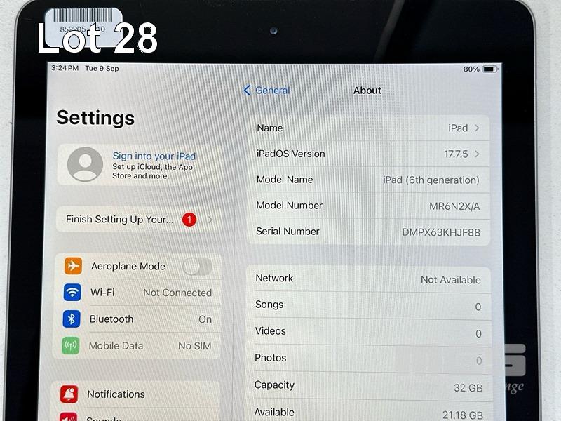 APPLE iPAD 6TH GEN, 32GB, Wi-Fi, CELLULAR, SPACE GREY, MODEL MR6N2X/A, A1954 (NO CABLE, NO CHARGER) (NOTE: MINOR SCRATCHES ON SCREEN) S/N:DMPX63KHJF88