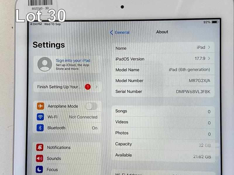 APPLE iPAD 6TH GEN, 32GB, Wi-Fi, SILVER, MODEL MR7G2X/A, A1893 (NO CABLE, NO CHARGER) S/N:DMPW68VLJF8K