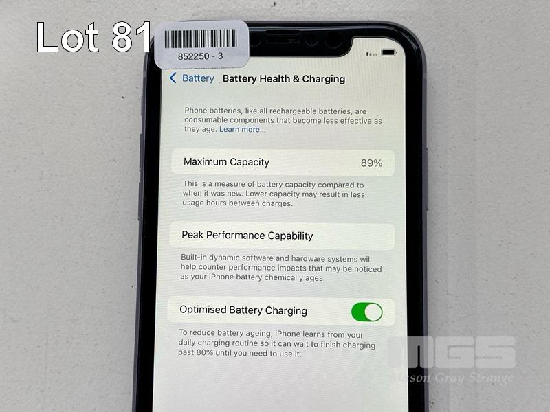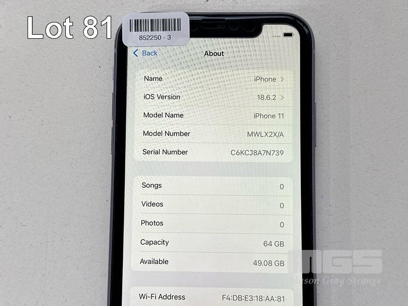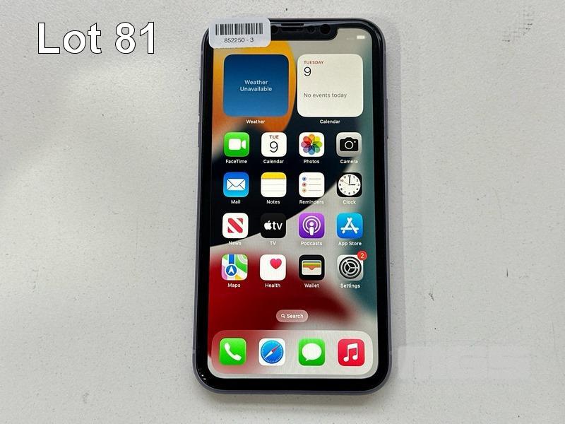 APPLE iPHONE 11, 64GB, MODEL MWLX2X/A, A2221, PURPLE, BATTERY HEALTH 87% (NO CABLE, NO CHARGER) S/N:C6KCJ8A7N739