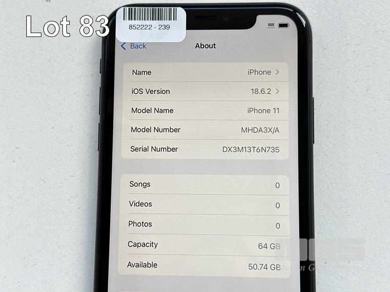 APPLE iPHONE 11, 64GB, MODEL MHDA3X/A, A2221, BLACK, BATTERY HEALTH 100% (NO CABLE, NO CHARGER) (NOTE: MINOR SCRATCHES ON SCREEN) S/N:DX3M13T6N735