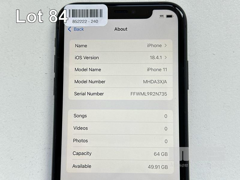 APPLE iPHONE 11, 64GB, MODEL MHDA3X/A, A2221, BLACK, BATTERY HEALTH 100% (NO CABLE, NO CHARGER) (NOTE: MINOR SCRATCHES ON SCREEN) S/N:FFWML9R2N735