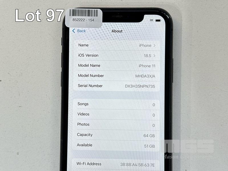 APPLE iPHONE 11, 64GB, MODEL MHDA3X/A, A2221, BLACK, BATTERY HEALTH 82% (NO CABLE, NO CHARGER) (NOTE: MINOR SCRATCHES ON SCREEN) S/N:DX3H3SNPN735