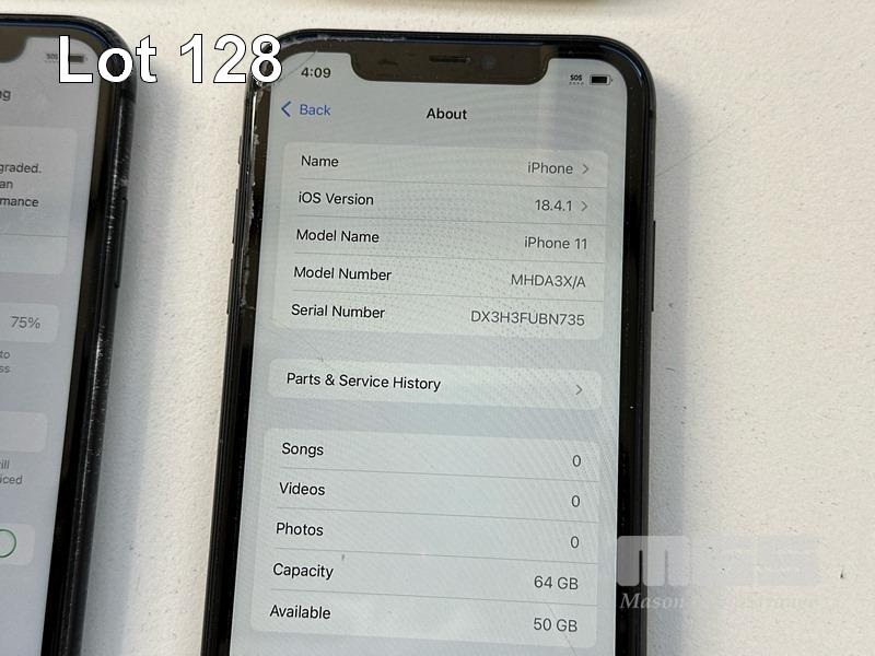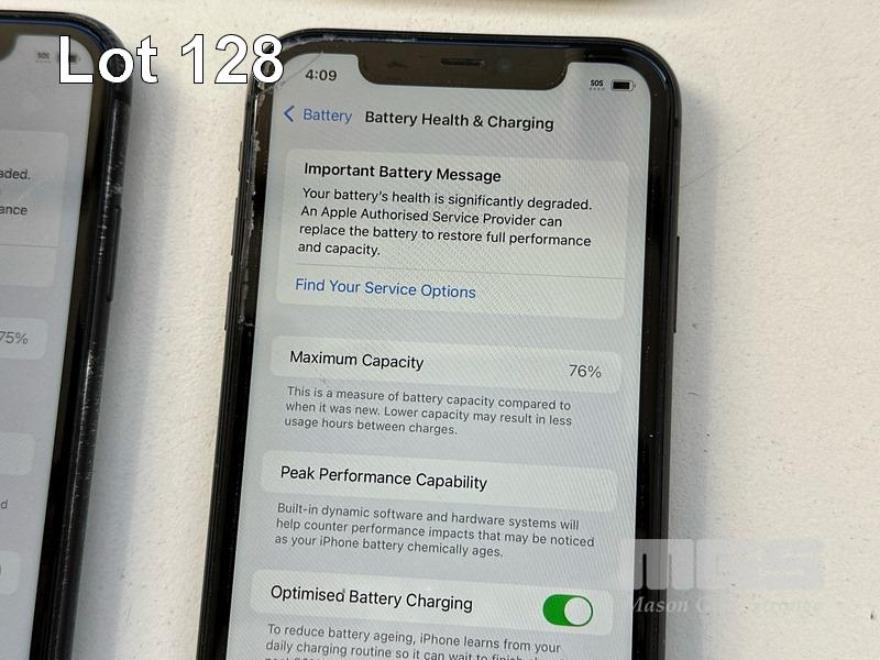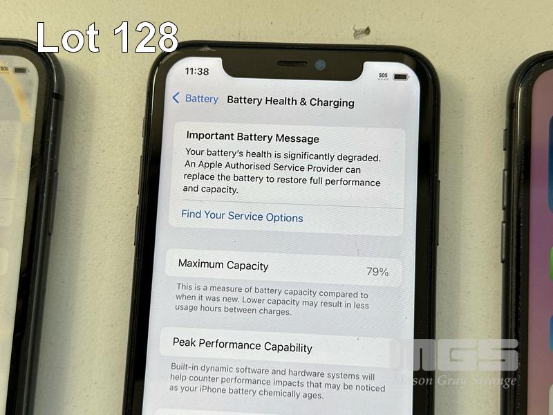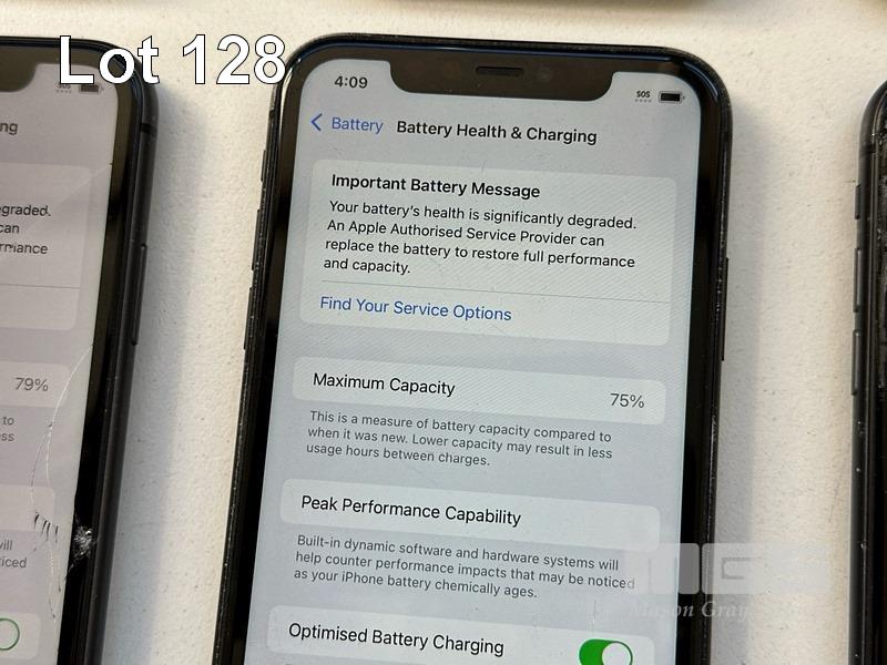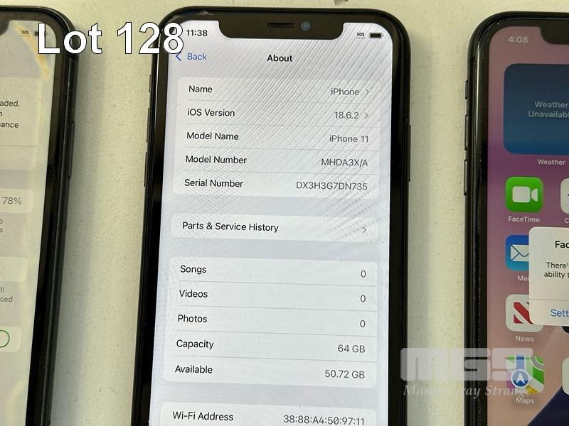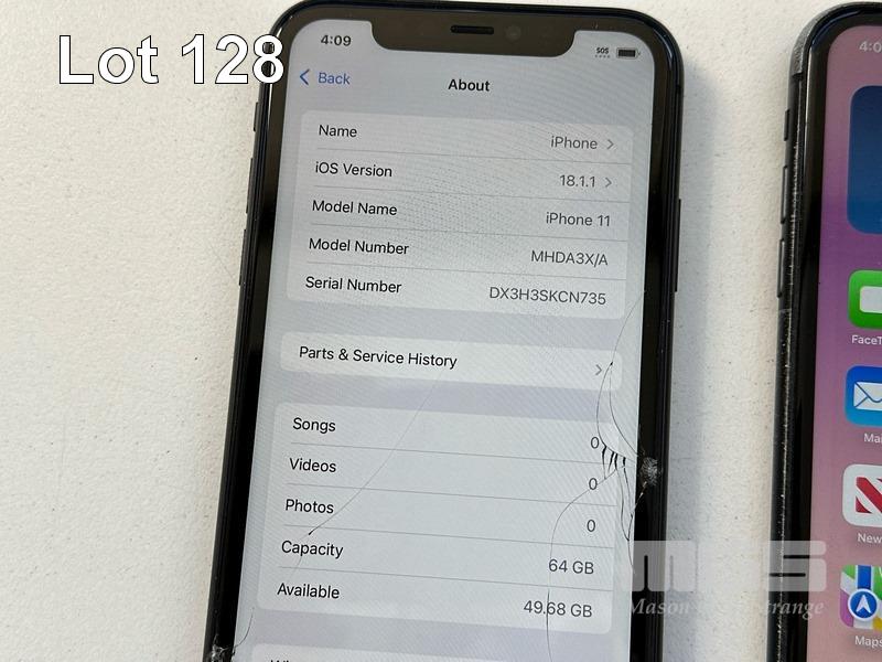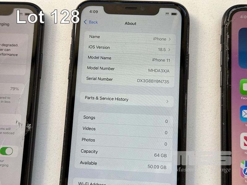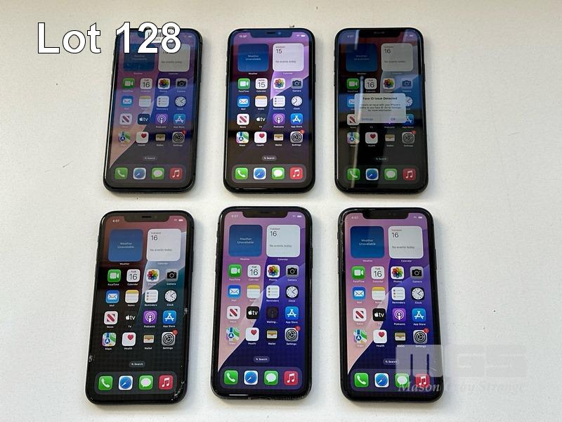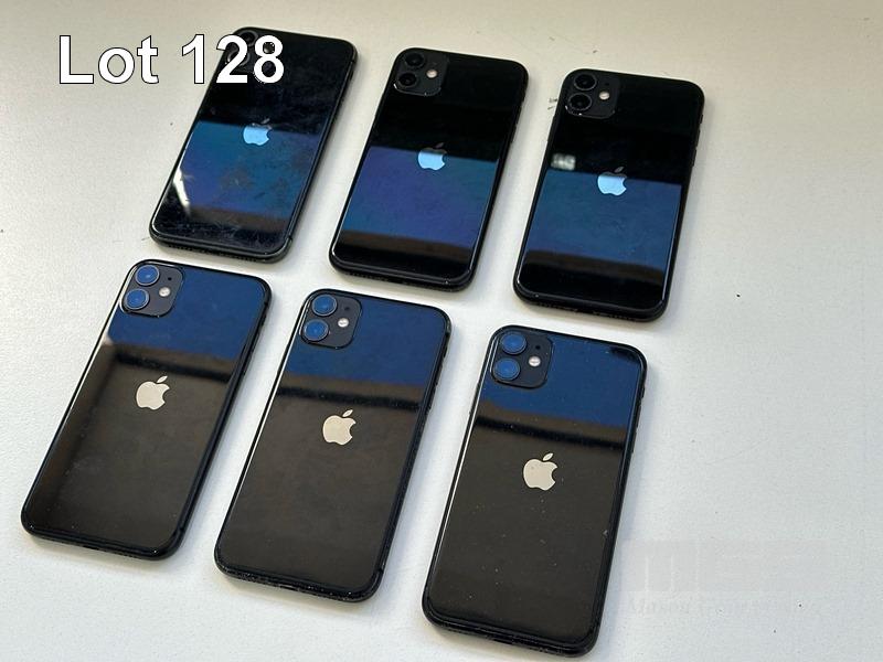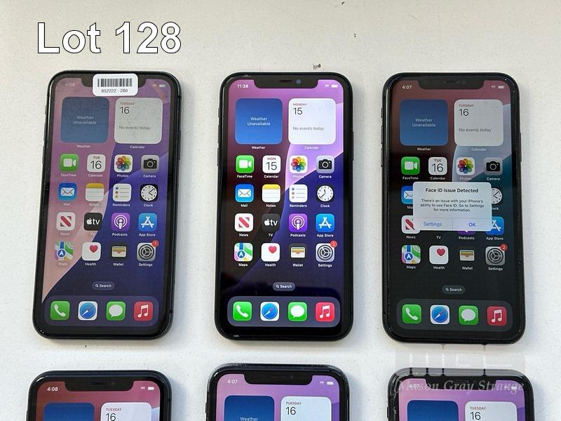 6 x APPLE iPHONE 11 INC. - 1 x iPHONE 11, 64GB, MODEL MHDA3X/A, A2221, BLACK, 78% (NOTE: SCREEN FAULT) - 1 x iPHONE 11, 64GB, MODEL MHDA3X/A, A2221, BLACK, 79% (NOTE: DISPLAY ERROR MESSAGE) - 1 x iPHONE 11, 64GB, MODEL MHDA3X/A, A2221, BLACK, 75% (NOTE: FACE ID ISSUE DETECTED) - 1 x iPHONE 11, 64GB, MODEL MHDA3X/A, A2221, BLACK, 79% (NOTE: DAMAGED) - 1 x iPHONE 11, 64GB, MODEL MHDA3X/A, A2221, BLACK, 85% (NOTE: CHARGING PORT ISSUE) - 1 x iPHONE 11, 64GB, MODEL MHDA3X/A, A2221, BLACK, 76% (NOTE: DAMAGED) (NOTE: ALL BATTERY SERVICE MESSAGES) (NO CABLES, NO CHARGERS) S/N:DX3H3G3YN735, DX3H3G7DN735, DX3H3FNUN735, DX3H3SKCN735, DX3G8BY0N735, DX3H3FUBN735